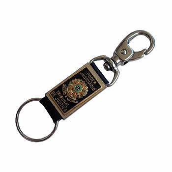 Chaveiro confeccionado em metal estampado, fixado tudo com couro legítimo, argola e mosquetão, acabamento dourado ou niquelado de alta qualidade, pintado à mão e coberto com uma camada de resina cristal.